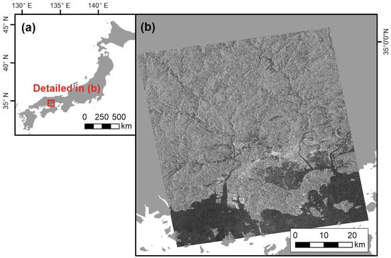 Study area: (a) map of Japan, showing detail area; (b) ALOS-2/PALSAR-2 data capturing the study area.