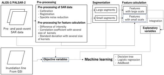 A general overview of this study is shown in Figure 3. First, pre-processing was applied to pre- and post-event ALOS-2/PALSAR-2 images that had been observed before and after the disaster, as shown in Section 3.1. As the ground truth data, data on the areas flooded in the 2018 Japan floods was downloaded from the website of Geospatial Authority of Japan and utilized, as detailed in Section 3.2. Next, feature calculation for creating the classifier was conducted, as described in Section 3.3. Pre-processing included calibration of the SAR imagery and feature detection by calculating the standard deviation of images and changes in the pre- and post-event sigma nought values. Then, a segmentation process was applied to obtain small-scale and large-scale segments, as described in Section 3.4. After that, features were calculated from the respective segments as explanatory variables, and “flood” or “not flood” information was applied to the data as objective variables, as described in in Section 3.5. Finally, three machine learning algorithms, namely, decision tree, logistic regression, and AdaBoost, were applied, and their performance was evaluated through the cross-validation. Based on the results, the performance of the small-scale and multi-scale approaches were compared, with the results of the comparison presented in Section 3.6.