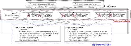 For feature calculation, change detection of pre- and post-event ALOS-2/PALSAR-2 images and texture images were calculated. For change detection, difference values of backscattering coefficients and correlation coefficients were calculated with several sizes of pixel windows. For calculating the texture image, local standard deviations on the pre- and post-event ALOS-2/PALSAR-2 images were calculated. The structure of this subsection is shown in Figure 5.