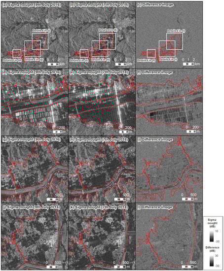 Examples of difference images are shown in Figure 6. Figure 6a is the pre-event sigma nought image, and Figure 6b is the post-event sigma nought image. Figure 6c is the difference image of Figure 6a,b. The other images from Figure 6d–i are zoomed images of them. As shown in Figure 6c, non-inundated areas are a gray color in most of the images, which means that the changes in the pixel values of the pre- and post-event sigma nought values were small. On the other hand, inside the inundation area certain areas in the difference images show a darker color or bright color. Zoomed images of the different regions are shown in Figure 6f,i,l. In Figure 6f, certain areas show a darker color in the lower part of image inside the inundation area. In these areas, uniformly-shaped structures were built pre-event. However, these disappeared in the post-event images; these areas were inundated by the floods. Therefore, the difference images show a darker color. In the upper part of Figure 6f, inside inundation area a darker color can be observed for the same reason. On the other hand, in Figure 6i,l it can be observed that a weak darker color is present in the whole inundation area. In order to extract those inundated areas where the pixel values themselves change little even though similar changes occur over a wide area, the segmentation process is considered more effective than simple thresholding.