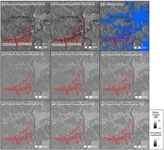 Examples of correlation coefficient images: (a) sigma nought image on 9 July 2016; (b) sigma nought image on 7 July 2018; (c) distribution of built-up areas, indicated by the blue color; (d–i) correlation coefficient image with (d) a kernel size of 3, (e) kernel size of 5, (f) kernel size of 7, (g) kernel size of 9, (h) kernel size of 11, and (i) kernel size of 13.
