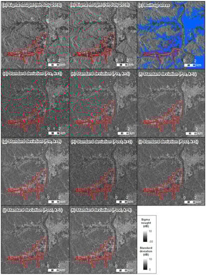Examples of standard deviation images: (a) sigma nought image on 9 July 2016; (b) sigma nought image on 7 July 2018; (c) distribution of built-up areas, illustrated by blue color; (d–g) are pre-event standard deviation images with (d) a kernel size of 3, (e) kernel size of 5, (f) kernel size of 7, and (g) kernel size of 9; (h–k) show the post-event standard deviation images with (h) a kernel size of 3, (i) kernel size of 5, (j) kernel size of 7, and (k) kernel size of 9.