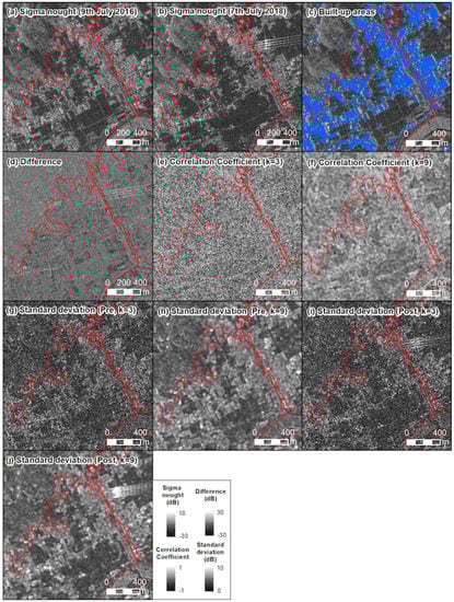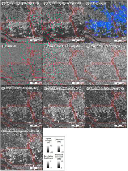 Detailed images of pre- and post-event sigma nought, difference, correlation coefficients and standard deviations are shown in Figure 9 and Figure 10. Different areas from flooded zones were selected and detailed imageries are shown in these figures. Figure 9 shows densely built-up areas. We can confirm that pre-event standard deviation images with a kernel size of 9 show higher values in built-up areas, as shown in Figure 9h. On the other hand, post-event standard deviation images with a kernel size of 9 show changes inside built-up areas, as shown in Figure 9h. From these differences, it can be inferred that standard deviation images might be a good indicator to detect changes in built-up areas caused by flooding. On the other hand, if we focus on Figure 9g,i, it can be seen that there are more localized changes in the standard deviation values. However, the confirmable changes are too sensitive, and the image appears to contains noise. Therefore, it might be considered that results with both smaller and larger kernel sizes should be utilized for flood detection. Regarding the difference image shown in Figure 9a, the flooded areas show relatively lower values. In addition, in the correlation coefficient images with the kernel size 3, as shown in Figure 9b, it is difficult to detect differences in built-up areas inside and outside the flooded area. However, in the correlation coefficient images with a kernel size of 9, as shown in Figure 9f, we can confirm that the correlation coefficient values of built-up areas show relatively lower values inside flooded areas than the outside of them. As can be seen in another zoomed image, shown in Figure 10, we can confirm the same characteristics as those in Figure 9.