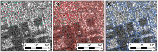 More examples of zoomed difference, correlation coefficient, and standard deviation images: (a) sigma nought image on 9 July 2016; (b) sigma nought image on 7 July 2018; (c) distribution of built-up areas; (d) difference image; (e) correlation coefficient image with kernel size 3; (f) correlation coefficient image with kernel size 9; (g) pre-event standard deviation image with kernel size 3; (h) pre-event standard deviation image with kernel size 9; (i) post-event standard deviation image with kernel size 3; (j) post-event standard deviation image with kernel size 9.