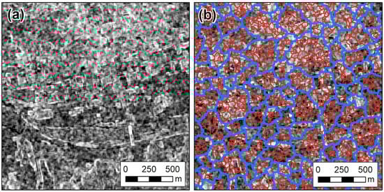 Next, a segmentation process was carried out in order to perform a multi-scale analysis of the difference, correlation coefficient, standard deviation, and backscatter coefficient images. Segmentation was performed by applying the region-growing method using eCognition Developer 10.1 software from the Trimble Company [].