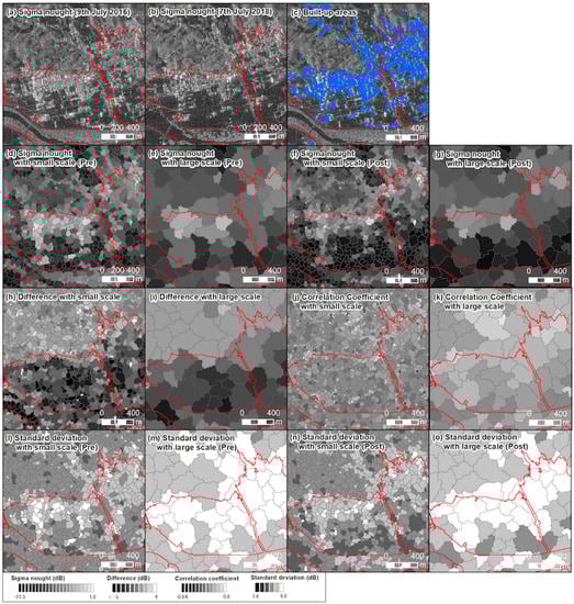 In addition, small-scale and large-scale segments from standard deviation images show changes between the pre-event and post-event images, as shown in Figure 9i–o.