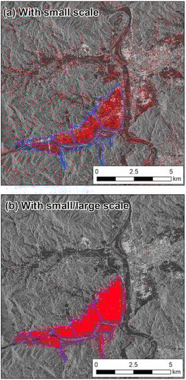 Results of flood detection with (a) small-scale approach and (b) integrated approach using both small and large scales.