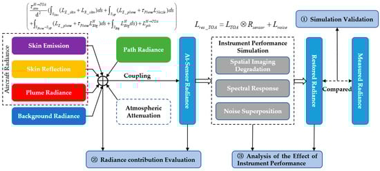 Space-based observed aircraft infrared radiation is affected by aircraft radiation, background radiation, atmospheric effects, and instrument performance. To further investigate the causes of space-based observed aircraft infrared radiation, a quantitative assessment of the various impact factors should be carried out. As shown in Figure 2, the research framework in this paper is as follows: Firstly, a model of aircraft space-based infrared observation radiation was developed, coupling aircraft radiation, background radiation, atmospheric effects, and instrument performance characteristics. Preliminary validations were carried out using space-based data and plume static measurement data. Then, based on the simulation model, the contributions of the skin emitted/reflected radiation, plume radiation, background radiation, and path radiation were calculated and evaluated at the aircraft body-leaving radiance and at-sensor radiance. Finally, the effects of GSD, MTF, SRF, and noise on T-B contrast were analyzed regarding the current level of instrument performance.