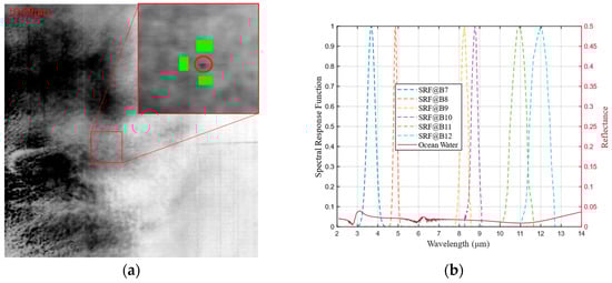 Auxiliary data for simulation, (a) aircraft position (red circle), the green box is selected cloud background area; (b) spectral response functions of B7–B12 and sea surface reflectance; (c) aircraft position and pixel aggregation information for B7–12 images.