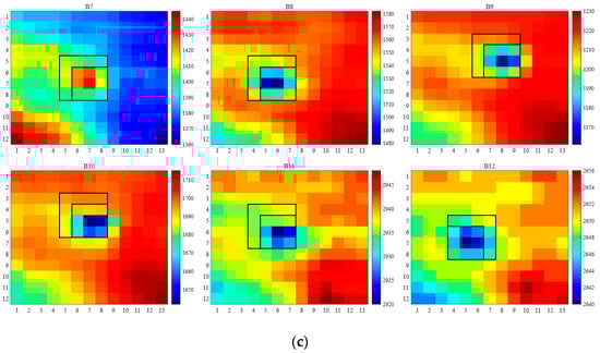 As shown in Figure 4c, it is not guaranteed that the aircraft is in a given pixel, and its position is inconsistent between different bands due to inter-band offsets. Accordingly, the target signal needs to be extracted band by band. To ensure that the aircraft signals are within a single pixel for simulation validation, the 3 × 3 and 4 × 4 pixel sizes were merged (shown in the black box in Figure 4c) to obtain the mixed signals at 120 m and 160 m spatial resolution.