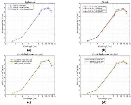 The main purpose of the simulation validation experiment was to examine the ability to simulate the space-based observational characteristics of the pixel containing the aircraft, and the spectral response was considered to describe the VIMS instrument performance. The spectral response functions of the B7–B8 were generated based on the spectral ranges given in Table 1 with Gaussian functions, and the B9–B12 spectral response functions were provided by the Numerical Weather Prediction Satellite Application Facility [46], as shown in Figure 4b.