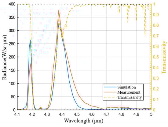 Plume infrared characteristic measurement experiments were carried out on the engine test stand [6]. The results were used to validate the plume simulation accuracy and to supplement the space-based observation simulation validation. The comparison between the measured and simulated results is shown in Figure 6. The MRE in the 4.1–5 μm was calculated to be approximately 61.64% (excluding the position of strong atmospheric absorption).