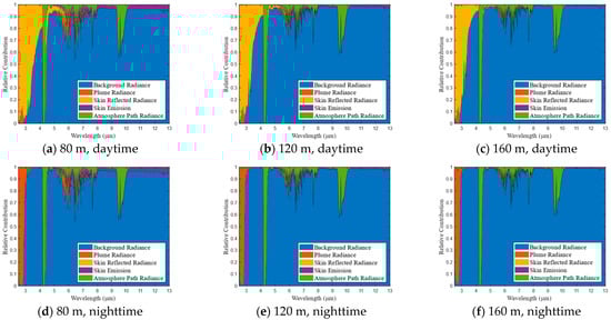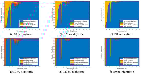 As shown in Figure 7a,c, the contribution of skin-reflected radiance to the body-leaving radiance at 2.5–3 μm is up to 98%, while the plume radiance occupies a smaller proportion but is still higher than the background radiance. Moreover, the plume and skin-reflected radiance also dominate near 4.3 μm, as the atmosphere has a strong absorption effect at these two spectral ranges, resulting in the lower background radiation energy. At all other spectrum bands, the background radiation makes up a large radiative contribution, especially in the long-wave infrared band, where it accounts for more than 90% and up to 99%. As shown in Figure 7d–f, the contribution of background radiation shows the same trend between daytime and nighttime. Still, the contribution of skin-reflected radiance at nighttime could be negligible due to the absence of solar radiation.