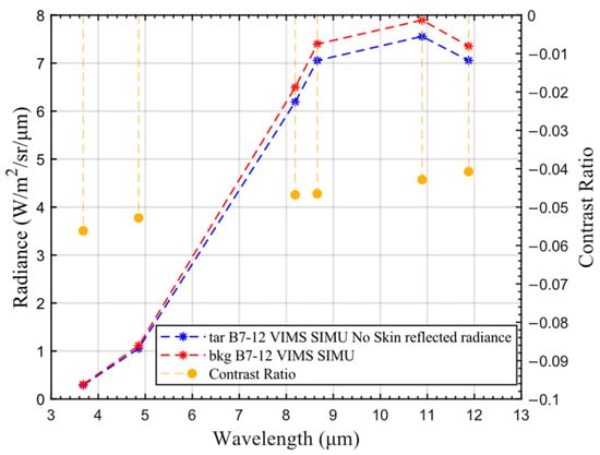 B7–12 radiance comparison of aircraft and background simulated without the skin reflected radiance. The left axis is the radiance, and the right axis is the contrast, where the negative number means that the target radiance is lower than the background radiance.
