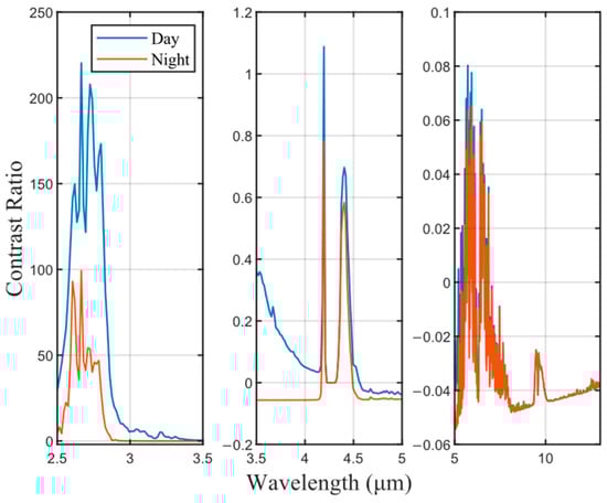 The results in Figure 11 and Figure 12 show consistently high contrast around 2.7 μm and generally higher contrast at 2.5–3.5 μm than that at 3.5–13 μm. Therefore, 2.7 μm was used in this paper as a general reference for 2.5–3.5 μm. Within 3.5–13 μm, contrast peaks occur around 4.2 μm, 4.4 μm and 5.7 μm. According to Figure 8a–c, it can be found that the skin-reflected radiation and the plume radiation at 2.7, 4.2, and 4.4 μm play a dominant role in making the contrast higher. In comparison, the contrast of 5.7 μm is smaller due to the small contribution of aircraft radiation. Besides, it should be noted that 72% of contrasts are negative at 2.5–13 μm, indicating that the aircraft pixel is darker than the pure background.