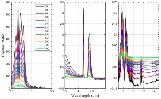The degree of T-B contrast affected by instrument performance varies across the characteristic spectral bands. Undeniably, the T-B contrast around 2.7 μm remains consistently high compared to other spectral bands. From Figure 14 and Figure 16, the contrast at 4.2 μm is more sensitive to FWHM and spectral calibration accuracy, while the contrast at 4.4 μm is more susceptible to instrument noise. Moreover, 5.7 μm does not have a significant advantage compared to other spectral bands.