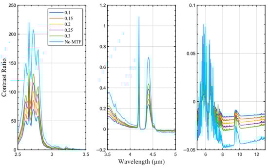 With regard to aircraft space-based observation characteristics, spatial degradation is the most intuitive impact factor. Figure 11 shows the T-B contrast spectra at different GSDs of 70–400 m. The spectral contrasts were shown in three segments due to the large difference between the different spectral ranges. The contrast becomes smaller in absolute terms as GSD increases, with a 97% reduction from 70 to 400 m. Because the lower the spatial resolution is, the higher the background radiance contribution is in the aircraft pixel, which makes the aircraft observed radiance closer to the background radiance. The contrast curves for different MTFs at the GSD of 120 m were presented in Figure 12, demonstrating that T-B relative differences increase with increasing MTF.
