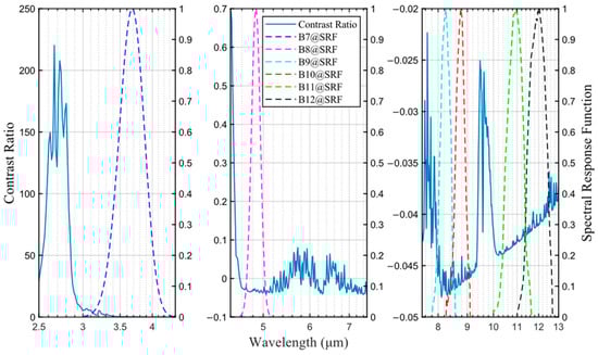 Apart from spatial degradation, the instrument’s spectral response is a non-negligible influence. The T-B contrast and the SRF for VIMS B7–12 at the GSD of 120 m are given in Figure 13. The B7 of VIMS has a central wavelength of 3.68 μm and an FWHM of 0.35 μm. The SRF of B7 does not cover the high contrast region of 2.7 μm, so the T-B contrast observed is not high. Meanwhile, the contrast in the spectral response region of the B8-12 is negative, so the aircraft pixel in these bands is darker than the background.