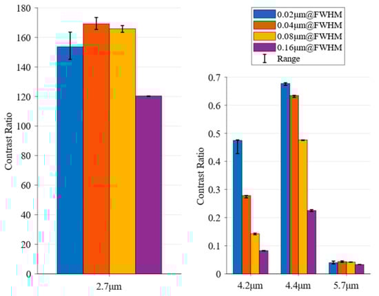 The contrast is constantly the highest at the central wavelength of 2.7 μm, as shown in Figure 14. The contrast varies inconsistently with the FWHM, indicating that the optimal FWHM for each spectral band is relatively independent. Furthermore, contrast variations caused by central wavelength shifts should be of attention. According to the error bar length, the 2.7 μm contrast variation range is greater and more sensitive to spectral calibration errors. The error bars of the 2.7 μm are equidistant in length between the positive and negative axes, suggesting that the central wavelength could be further optimized to improve the contrast, with the 5.7 μm position showing a similar phenomenon. It is also found that the length of the error bars decreases with the increase of FWHM, indicating that the wider the spectral response range is, the less the contrast is affected by the central wavelength shift. However, an excessively wide spectral response range also reduces the contrast. It is thus essential that the appropriate spectral response is selected while properly controlling the spectral calibration error.