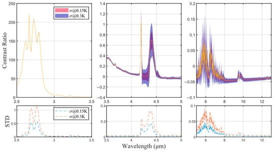 The noise was added in the aircraft observed radiation, assuming that the background radiance is the result of averaging over a uniform scene and is not affected by noise. Figure 16 shows the range of variation in contrast and its standard deviation (STD). The results indicate that the standard deviation is greatest, around 2.7 μm, but its effect is almost negligible due to the large contrast. The range of contrast variation around 4.25 μm and 6μm covers the zero axis, indicating a change in the T-B relative relationship (light-dark relationships). It is obvious that a change in the T-B light-dark relationship is not expected, which seriously affects the distinction between the target and background.