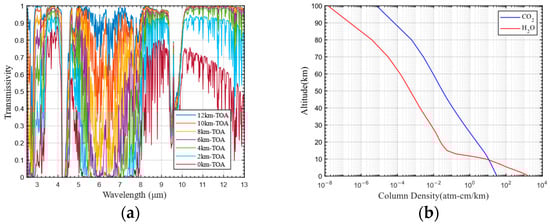 The stronger atmospheric attenuation for the background, in addition to the difference in radiation between the aircraft and the background itself, is an important cause of the higher contrast at 2.7 μm. The atmospheric transmittance from a 0 to 12 km altitude to the TOA and atmospheric profile of CO2 and H2O were given in Figure 17. The whole atmosphere transmittance is almost zero around 2.7, 4.3, and 5–8 μm, which limits the Earth’s surface radiation (only path radiance remained) observed by satellite remote sensing. It is the lower atmospheric transmittance and the path radiation at 2.7 μm that results in lower background radiation, meaning that only very small aircraft radiation is required to create high contrast. As seen from Figure 17b, the main gas molecules of atmospheric attenuation are distributed at a 0–10 km altitude, which objectively enables some non-atmospheric windows to be detection spectral windows for aerial targets in the air.