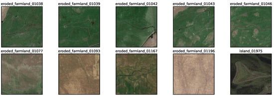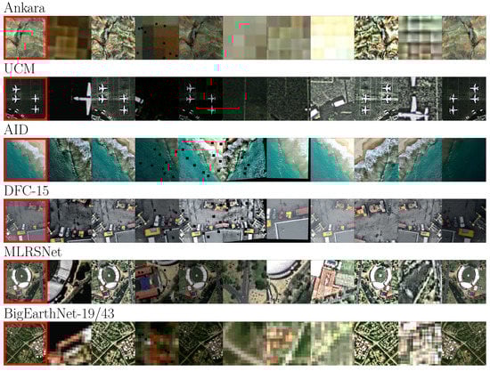 The MLRSNet dataset is an RSI dataset containing optical satellite images with high spatial resolution [31]. It contains 109,161 RSI annotated with 60 predefined class labels, where the number of labels per image varies from 1 to 13. The images have a fixed resolution of pixels, where the pixel resolution varies from ∼10 m to m. This dataset can be used for a wide range of learning tasks, such as multi-label classification, multi-class classification, multi-label image retrieval, and image segmentation. There are 10 images that do not have labels assigned, as shown in Figure 2; therefore, we exclude these images from the experiments. The final dataset contains 109,151 images.