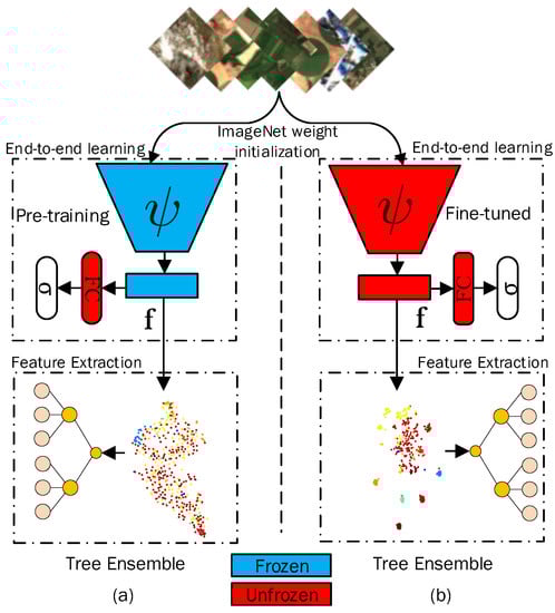 We address the MLC task by applying a Convolutional Neural Network (CNN) as a deep learning approach and exploiting the the transfer learning paradigm. We use the weights learned on the ImageNet as the initialization procedure, and we further perform calibration by fine-tuning the models on the training sets of of RSI. The deep models are used in two different scenarios, namely as end-to-end approaches to directly perform the MLC task (Figure 3a,b), and as CNN-based feature extractors (Figure 3a) to generate feature representations, which are used as inputs to the tree-ensemble methods such as Random Forests and Extremely Randomized Trees for MLC (Figure 3c).