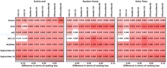 These differences in performance are presented in Figure 6. We observe that for smaller datasets (e.g., Ankara, UCM, etc.), pre-training is the preferred choice, which can be mostly seen for the VGG architectures trained in an end-to-end manner over the DFC-15 dataset, where the largest differences in ranking loss are observed. These differences are slightly smaller for the DFC-15 dataset and the tree-ensemble methods. On the other hand, the fine-tuned versions of the models perform significantly better when data availability is not a problem. Furthermore, for the tree ensemble methods, the differences in performance are significantly increased (and more on the positive side), which points to the fact that the quality of the feature representations is of great importance for the tree ensemble methods to further boost their predictive performance. Overall, we can conclude that by solely relying on the ImageNet pre-training, we end up with worse model performance in almost all cases, because the content present in RSI is quite complex as compared to images present in the ImageNet dataset. More detailed results of the analysis are presented in Table A1 (Appendix A), where the performance figures for the ranking loss measure are given.