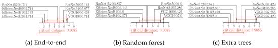 Comparison between different network architectures in terms of ranking loss. The results are presented in the form of average rank diagrams at 0.05 significance level for (a) End-to-end learning, (b) Random forests and (c) Extra trees. The best ranking methods are at the left-most side of the diagram. The difference in performance among the methods connected with a red line is not statistically significant.