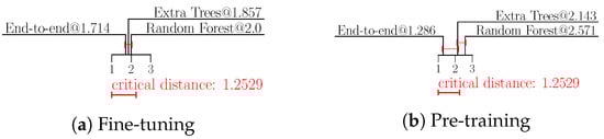 To answer the experimental question of how end-to-end learning and feature extraction plus the tree ensembles compare in the task of RSI MLC, we present the results in the form of average rank diagrams, where we use the pre-trained and fine-tuned versions of the EfficientNet-B2 model. Recall that EfficientNet-B2 produced the best results overall, either when used as a feature extractor where the extracted feature representations are further utilized in the tree ensembles, or as an end-to-end approach to directly address the MLC task. The results are shown in Figure 8a for fine-tuning and in Figure 8b for pre-training only.