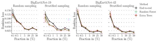 Based on the analysis from Section 4.1, we used the fine-tuning approach to further explore which network architecture is the most suitable choice for RSI MLC tasks. The results are shown in terms of ranking loss and in the form of average rank diagrams. From Figure 7, we see that the EfficientNet variants, especially EfficientNet-B2, tend to produce the better results as compared to other network architectures. The differences in performance are statistically significant as compared to the VGG variants. The results also reveal that the EfficientNet-B2 model, used as base feature extractor in combination with tree ensemble methods, such as RF as in Figure 7b and ET in Figure 7c, is the clear winner, which indicates that this network architecture is the best choice for this task. Moreover, the ResNet-based network architectures are the closest competitors to EfficientNet variants (both when used with tree ensembles and in an end-to-end manner), i.e., the ResNet-152 model. Although the EfficientNet variants are not statistically significantly better than ResNet-152, they are by far more lightweight in terms of model parameters (e.g., EfficientNet-B0 is approximately smaller, EfficientNet-B1 is , and EfficientNet-B2 is approximately smaller than ResNet-152, respectively). Comparison between different network architectures in terms of other MLC performance measures in the form of average rank diagrams is given in Figure A1,Figure A2,Figure A3,Figure A4,Figure A5 and Figure A6 in the Appendix A (Figure A1,Figure A2 and Figure A3 for fine-tuned features and label-based, example-based and ranking-based measures, respectively, Figure A4,Figure A5 and Figure A6 for pre-trained features and label-based, example-based and ranking-based measures, respectively).