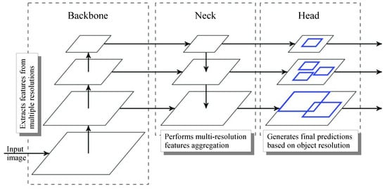 Figure 2, YOLO is a single-stage object detector with three important parts in its architecture: the backbone, neck, and head. The backbone is responsible for the extraction of features from the given input images, the neck mainly generates the feature pyramids, and the head performs the final detection as an output.