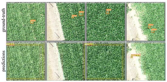Figure 4, the YOLOv7 model pretrained on LB was not able to predict the weeds’ bounding boxes from the CP test set images. In many images of the CP dataset, the pretrained model predicted some very large bounding boxes compared with the size of the plants present in the images. This situation was due to the significant difference between the two datasets. The model was trained to recognize weeds from the LB dataset, in which the plants are all seen at close range as well as spaced apart, and the underlying ground is almost always visible between the plants. In the CP dataset, on the other hand, the plants are always seen from a greater distance and are all close together. This difference explains the very large bounding boxes, where the content was a continuous but uninterrupted expanse of chicory plants and weeds wherever the underlying ground was not visible.