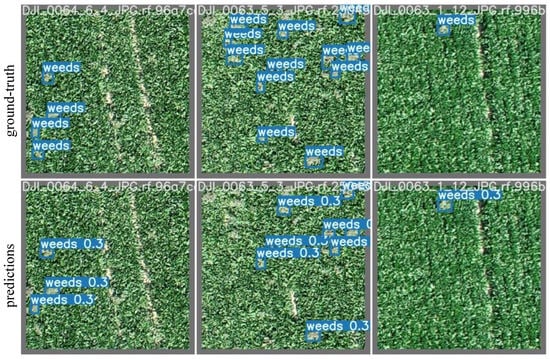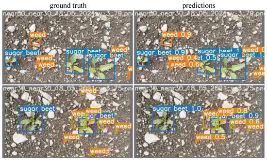 33], and it achieved the highest mAP values for weed and sugar beet detection. It improved the accuracy from 51.0% to 61.0% compared with YOLOv5. It also enhanced the results from 67.5% to 74.1% and from 34.6% to 48.0% in the case of mAP for sugar beets and weeds, respectively.