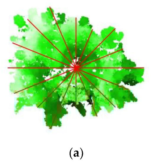 (a) Width of the canopy evaluated on eight different directions with an inclination of 22°30′; (b) evaluation of the height of the canopy; and (c) evaluation of the height of the trunk and of the tree.