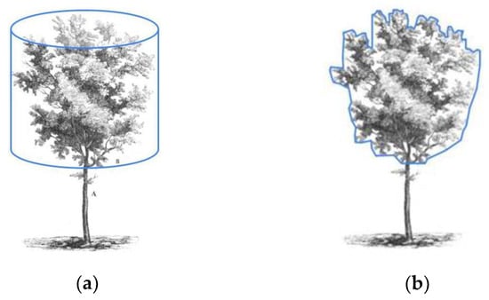 Figure 5. (a) Volume of the canopy assimilated to a cylinder (method 1); and (b) volume of the canopy evaluated considering the shape of the canopy obtained from the 3D point cloud (method 2).