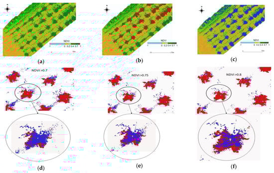The overlap between the DSM of the canopy and the NDVI map has been noted (Figure 7a,b), but there are some problems related to the vegetation present on the ground between the trees that do not allow unique identification of the single canopy. For this reason, the NDVI map was filtered with values higher of 0.7 highlighted in blue (Figure 7c). The further overlap between the NDVI map (>0.7) and the DSMcanopy showed in Figure 7d that some pixels with vegetation do not belong to the canopy. The same analysis was repeated for NDVI values of 0.75 (Figure 7e) and 0.8 (Figure 7f). Therefore, by filtering by increasing values, there was an important reduction in the number of pixels relative to the vegetation on the ground. Still, inside the canopy, there was a significant increase in empty areas. To solve this problem, in a GIS environment, a combination “pixel to pixel” between the altimetric information derived from point cloud and the NDVI map (with threshold NDVI = 0.3) was possible (Figure 8a,b).