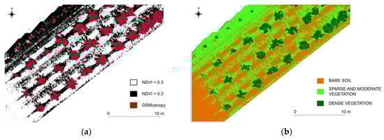 (a) Overlap between the NDVI map (NDVI = 0.3) and DSMcanopy (red); and (b) intersection between NDVI map and DSMcanopy.