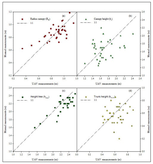 The data obtained from two methods are shown in Figure 9a–c. The black dotted line represents the ratio 1:1. All the Rc data obtained by the UAV survey were lower than the manual measurements for hc and htree. For htrunk it is not possible to define a clear trend. The characteristics that showed more variation were hc and htrunk.