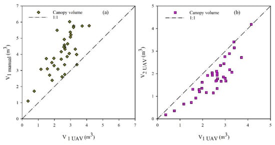 The black dotted line represents a 1:1 ratio; (a) comparison of the canopy volume calculated from UAV using the method 1 V1,UAV and the manual measurements V1,manual; and (b) comparison of the canopy volume calculated from UAV using method 1 V1,UAV and method 2 V2,UAV.