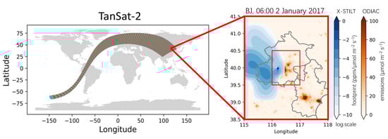 We used the column version of the Stochastic Time-Inverted Lagrangian Transport model (X-STILT) [60,61,62] to link surface CO fluxes to variations in atmospheric column CO at the locations of satellite sampling. X-STILT tracks the movement of air parcels backwards in time for 24 h. We applied a typical averaging kernel profile of OCO-2 and pressure weighting functions to the model fields to describe the footprints of satellite-based atmospheric CO measurements (Figure 2). The footprints describe the sensitivity of CO columns at the receptors (locations where the satellite observes the atmosphere) to upwind surface fluxes. In order to drive air parcels in X-STILT, we used meteorological data from the Global Forecast System with a horizontal resolution of 0.25 degrees (GFS0.25, https://www.ready.noaa.gov/data/archives/gfs0p25/ (accessed on 25 September 2023)) [63]. A total of 3000 air parcels evenly distributed from the surface to a 3 km height were released from the atmospheric column of each observation. We simulated footprints for the cloud-free observations sampled by TanSat-2. The sum of the convolution of the footprints and the ODIAC inventory represents the urban CO enhancements from upwind CO fluxes, as sampled by air parcels arriving at the locations of each sample.