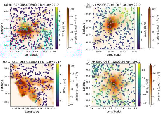 We used the Open-source Data Inventory for Anthropogenic CO (ODIAC, version 2020b) for monthly mean CO emissions from fossil fuels at a spatial resolution of 1 km × 1 km [58,59]. This data product uses satellite observations of night-time light and power plant profiles, including emission intensity and geographic location, to distribute CO emission estimates from fossil fuel combustion at the country level. Sources of systematic and random flux errors are due to spatial and temporal disaggregation that vary by emission sector at different scales (from national to urban) and uncertainties in the use of night-time light data as an emission proxy. We used ODIAC to define our broader study domains for urban areas and to ensure that anthropogenic source regions that lie outside the spatial extent of TanSat-2 were included (Figure 3). BJ (9.84 tCO s) and JN (1.63 tCO s) emissions of CO are concentrated in the city centre, with high emissions beyond 60 mol m s (Figure 3), home to about 21.54 and 8.7 million people. LA (3.67 tCO s) and PR (1.81 tCO s) show fewer CO emissions ranging from 10 to 20 mol m s (Figure 3), home to about 3.85 and 2.16 million people, where emissions are distributed with the expansion of city.