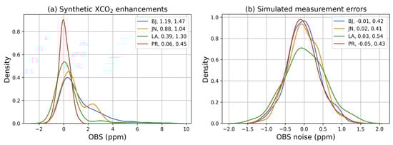 Probability density of synthetic enhancements in Beijing (BJ), Jinan (JN), Los Angeles (LA), and Paris (PR) (a) along with the corresponding measurement errors (b). The values (in units of ppm) after the city names are the mean (first number) and standard deviation (second number).