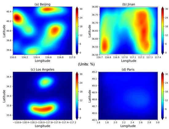 Urban CO enhancements in Beijing (a), Jinan (b), Los Angeles (c), and Paris (d).
