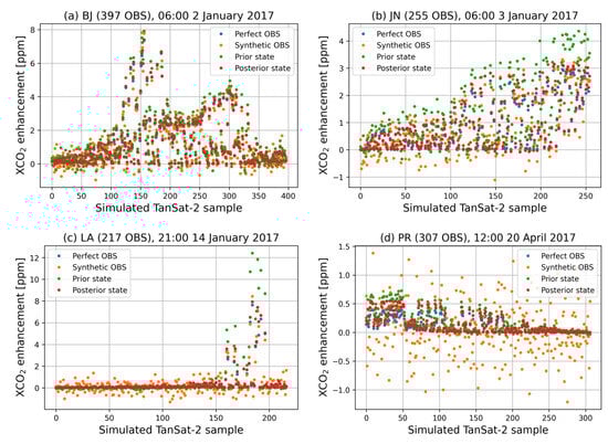 We simulated synthetic TanSat-2 sampling over the cities of BJ, JN, LA, and PR on four arbitrary clear-sky days in January and April 2017 (Figure 3). The scattered distribution of cloud-free samples is due to the randomness of small-scale clouds, which are not resolved by the ERA5 cloud data. The differences in CO enhancements across the four cities (Figure 4a) are due to different emission levels and footprints associated with local meteorological conditions. The synthetic column CO enhancements (with measurement errors) in the four cities range from −2 ppm to 8 ppm, similar to previous studies [20,48,74,75]. The mean value of enhancements in BJ is 1.19 ppm, with a random error of 0.42 ppm (Figure 4b), resulting in a maximum signal-to-noise ratio of 2.8, followed by JN (2.1), LA (0.7), and PR (0.1). The signal-to-noise ratio of satellite data is an important indicator of flux error reduction, which shows significant correction in BJ and JN and negligible error reduction in PR (Figure 5). The sizable error reduction in each city is concentrated in the region with significant enhancement signals and high-density satellite sampling (Figure 3).