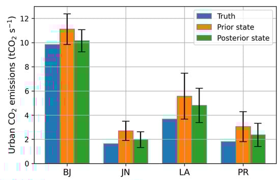 The launch of TanSat-2 is planned for 2025. TanSat-2 is a satellite cluster consisting of two to three satellites measuring at an across-track swath of 2900 km and with a pixel size of 2 km × 2 km. The precision of its measurements is expected to be less than 1 ppm. It is intended to verify satellite data using ground-based measurements from the Total Carbon Column Observing Network [53,54,55] and EM27/SUN measurements [56] for optimizing parameters in satellite sampling. In this paper, we evaluate the theoretical ability of TanSat-2 to detect urban CO emission signatures based on a closed-loop inversion system (Figure 1). We simulate synthetic data sampled by TanSat-2 in Beijing (BJ), Jinan (JN), Los Angeles (LA), and Paris (PR) while accounting for the impacts of cloud cover and aerosol loading. We compare the effectiveness of correcting flux bias and random errors in different cities. Finally, we discuss limitations and uncertainties in linking these results to real-data inversion experiments.