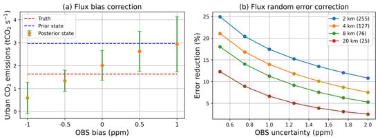 We investigated the sensitivity of flux estimates to bias in satellite data for the medium-size city of JN (Figure 8a), which is a typical city in terms of the area of the city. A systematic measurement error of ±1 ppm would significantly degrade emission estimates inferred from the data, especially when the observation bias and the flux bias are in the same direction. A slight bias within −0.5 ppm in the data, in the opposite direction of a priori flux bias, is beneficial for improving the integrated estimate of CO emissions. Figure 8b shows the sensitivity of the flux error reduction to observation uncertainties, including atmospheric transport errors, under different resolutions of satellite sampling. The peak spatially-averaged error reduction is approximately 25% with an observation uncertainty of 0.5 ppm and the largest number of measurements. The lowest error reduction is for the minimum data availability (25 OBS) and a sampling resolution of 20 km. Moreover, the scenario of 4 km resolution (127 OBS) with 1 ppm observation uncertainty shows similar error reduction to the scenario of 8 km resolution (76 OBS), with a 0.75 ppm random error, indicating that better measurement precision can partially compensate for fewer measurements.