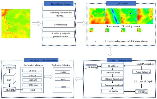 In this paper, considering the complex and extensive nature of DBM seabed terrain features, a seabed terrain feature extraction transformer (STFET) is proposed to achieve DBM SR, combining ResNet with deformable convolutional layers and an efficient transformer. The following are this paper’s key contributions: