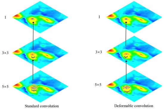 DBM often has clear topographic undulations in local areas, generating different topographies, and the depth distribution of DBM is closely related to the topographic features of local areas. The effective extraction of seafloor topographic features can provide more accurate feature maps, thereby improving the quality of SR DBM. Very deep convolutional networks (VDSRs) [] were the first to use ResNet for the SR domain of images, as they can utilize both deeper neural networks and mitigate the problems of disappearing or exploding gradients and network degradation. Seabed terrain features have different shapes, and the convolution kernel used in the traditional convolution layer is usually in the shape of an n × n regular grid, which makes it difficult to extract complicated seabed terrain features. To extract complex-shaped objects or terrain features, researchers have replaced conventional convolutional layers with deformable convolutional layers [,]. Deformable convolution adds an offset to the regular convolutional layer, which is implemented using an additional convolutional layer, as shown in Figure 3. In order to always be able to cover complicated terrain features, the deformable convolution mechanism makes sure that offsets can be learned during the learning process. Therefore, the deformable convolution layer can improve its ability to extract terrain features. In this paper, we replaced regular convolutional layers in the residual network with deformable convolutional layers, and the feature extraction process of the conventional convolutional layer and the deformable convolutional layer in the DBM is shown in Figure 4. When the conventional convolutional layer extracts terrain features because the convolution kernel is regular, the edge terrain features are easily overlooked, whereas the deformable convolutional layer can adaptively extract seabed terrain features by learning during training.