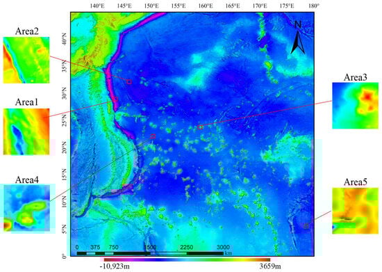 To evaluate the performance of DBM in different terrain regions, we selected five regions with more significant topographic features from the test set to conduct an accuracy comparison. These five regions contained highly undulating and complex terrain, including trenches and seamounts. The locations are shown in Figure 6. Among them, the extremum between area 2 and area 5 was small, and the terrain undulation was relatively moderate, while the topographic features of areas 1, 3, and 4 were more obvious. The original DBM for the five regions and the SR DBM reconstructed using different SR methods were combined for comparison, and the quantitative results are shown in Table 2.